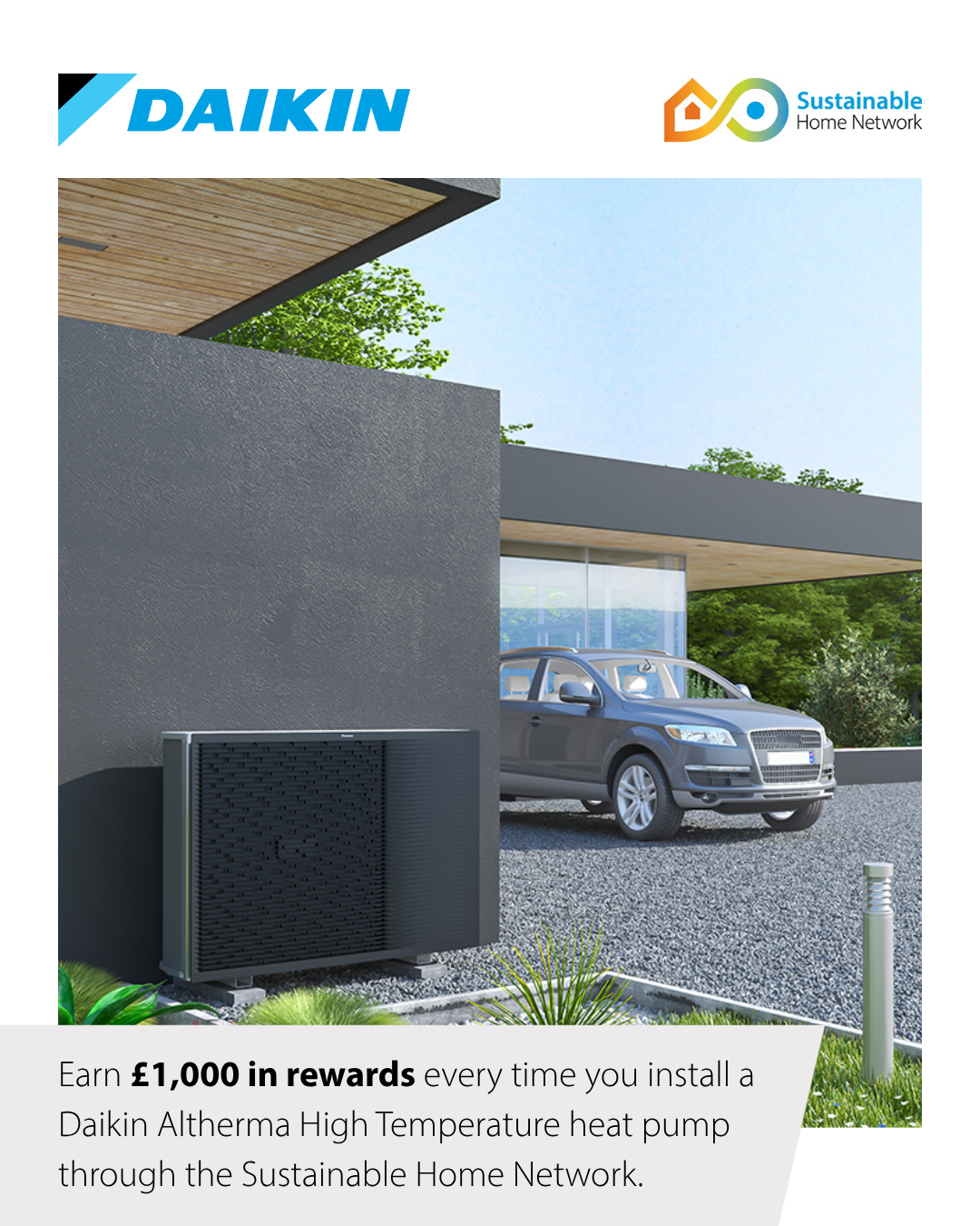 Daikin has launched a limited-time installer incentive, giving accredited Sustainable Home Network installers £1,000 in rewards every time they install and register a qualifying Daikin Altherma High Temperature heat pump.