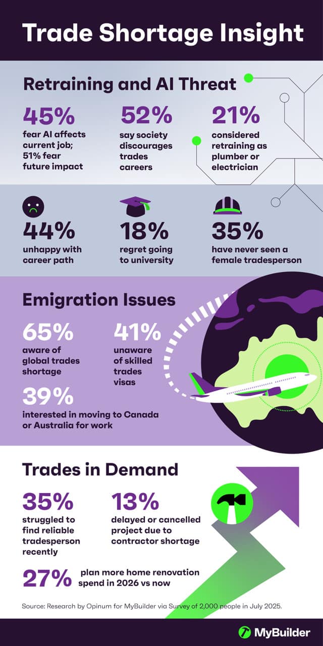 The study found that 45% of people fear AI will affect their careers, while 21% have considered retraining in a trade such as plumbing or electrics. Interest is particularly strong among younger workers, with 34% of 18-34 year olds surveyed saying they’d thought about switching to the trades.