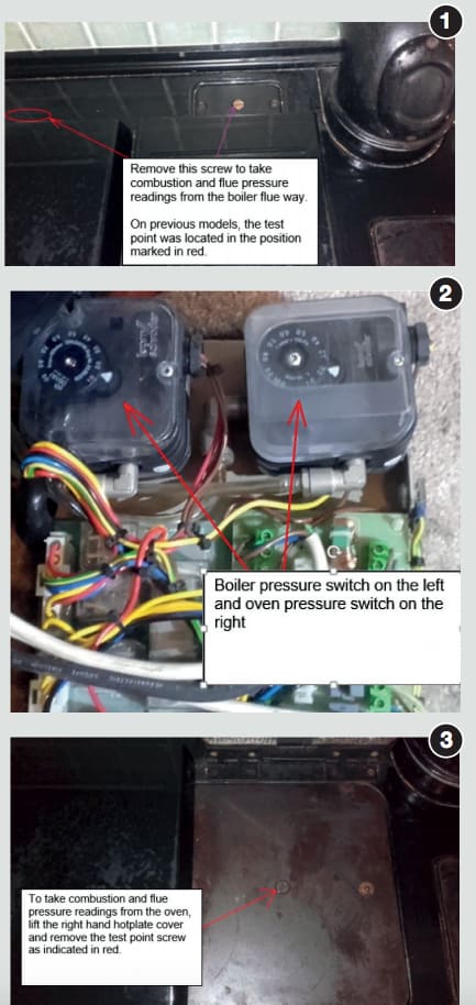 - With the BOILER burner in operation, conduct a combustion analysis and confirm that the air setting on the burner is correct to achieve satisfactory combustion of approximately 9.5-10 per cent CO2 when measured at the boiler combustion test point at the rear of the cooker top behind the hotplate covers. Setting of the air adjuster may be required to correct CO2 readings, if no other gasrelated or flue defects are present (photo 1)