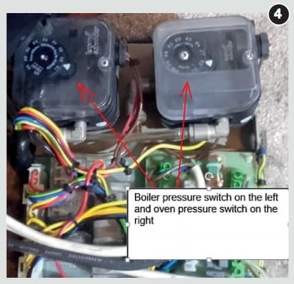 - With the OVEN burner in operation, the OVEN pressure switch should be increased very slowly to detect the switching point. The burner control box should lock out, and the burner extinguish, to confirm that the contacts are operating correctly. Then the OVEN pressure switch should be set to between 0.25-0.3mbar below the switching point. If the oven pressure switch set point is below 1.8mbar, it indicates that there is undiagnosed problem which must be resolved (photo 4). Where it is not possible to repair or resolve the problem, the current Gas Industry Unsafe Situations Procedure (GIUSP) should be implemented and the appropriate actions and warning notices/labels completed and issued.