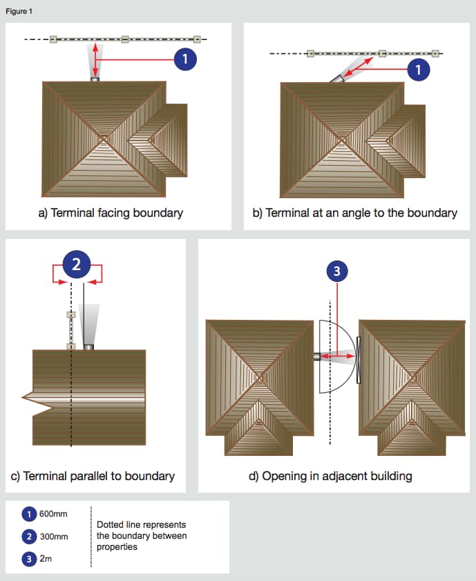 With regard to proximities to boundaries, the flue duct outlet of a gas appliance needs to be sited so that it is at least 600mm from the boundary line when facing it and at least 300mm from the boundary line when running parallel to it. A flue duct outlet can be angled away from the boundary so that the distance between the outlet and the boundary can be maintained to at least 600mm, provided that the shortest distance between the terminal and the boundary is not less that 300mm (see Figure 1).