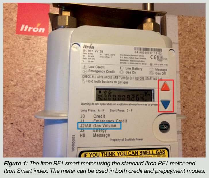 The display sequence will start with “J0”. Press the blue button twice to navigate to “J2”, which is the Gas Volume Index. Make sure that there is at least two minutes’ worth of emergency credit available on the meter or the gas rate test cannot be completed.