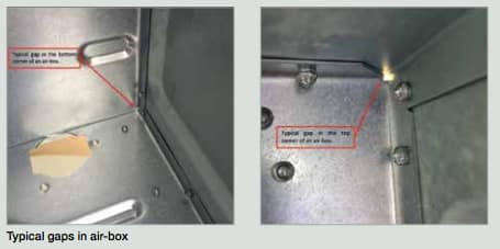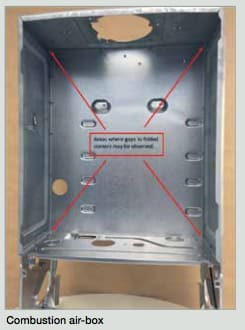 It is perfectly normal to see small gaps on the folded corners of the steel air-box; there is no requirement for the air-box to be completely air-tight. Every Worcester Greenstar boiler is tested at the end of the production line to ensure it complies with all applicable and appropriate standards and operates correctly. The test data from all Worcester appliances are fully traceable and auditable.