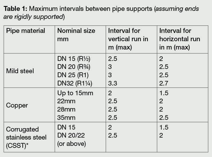 All pipework must be secured at each end using suitable clips and/or the meter bracket to provide support and to prevent movement. For long pipe sections, the maximum distances between pipe supports are shown in Table 1, which is an extract from BS 6891:2015 + A1 2019.